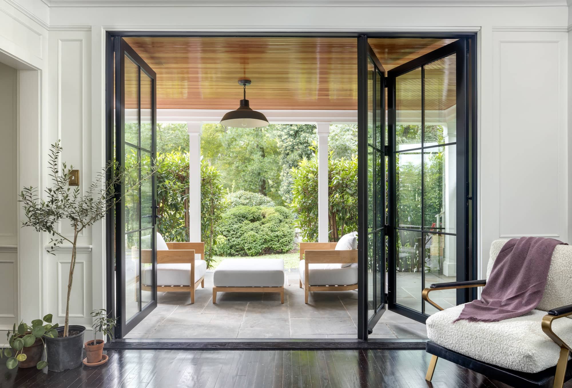 Though the covered porch was already in place, its small French doors limited access and views. A new retractable glass door system brings in natural light, blurs the line between indoors and out, and transforms the porch into a true extension of the home—not just a pass-through.